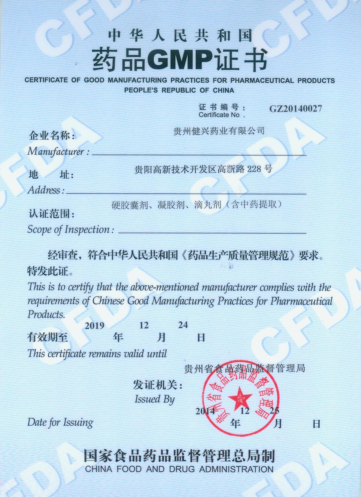 貴州省藥監局于11月份開始,對公司原有廠房和車間、新增廠房和車間,進行全面檢查,結果認定為合格,因此于本月25日向公司換發新的GMP證書。