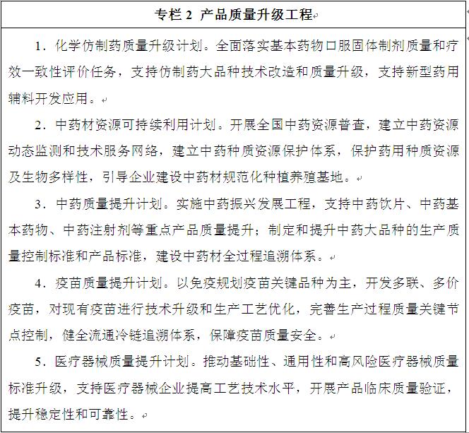 推動重點領域質(zhì)量提升。全面提升基本藥物質(zhì)量水平,落實仿制藥質(zhì)量和療效一致性評價要求,完成國家基本藥物口服固體制劑的一致性評價任務。完善中藥質(zhì)量標準體系,提升中藥全產(chǎn)業(yè)鏈質(zhì)量控制水平,提高產(chǎn)品質(zhì)量均一性和可控性。實施國家醫(yī)療器械標準提高行動計劃,開展與國際標準對標,制定在用醫(yī)療器械檢驗技術要求,推動企業(yè)改進產(chǎn)品設計、制造工藝和質(zhì)量控制,提升醫(yī)療設備的穩(wěn)定性和可靠性。加強藥用輔料和直接接觸藥品的包裝材料和容器的標準體系建設,增加國家標準收載品種,鼓勵企業(yè)提高規(guī)范生產(chǎn)能力,提升質(zhì)量控制水平。推動企業(yè)建立完善測量管理體系,促進提質(zhì)增效。