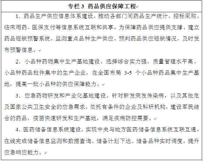 ——供應保障。國家基本藥物、常用低價藥供應保障能力加強,臨床用藥短缺情況明顯改善,臨床急需的專利到期藥物基本實現(xiàn)仿制上市,國家醫(yī)藥儲備體系進一步完善,應對突發(fā)公共衛(wèi)生事件的應急研發(fā)和應急生產(chǎn)能力顯著增強。
