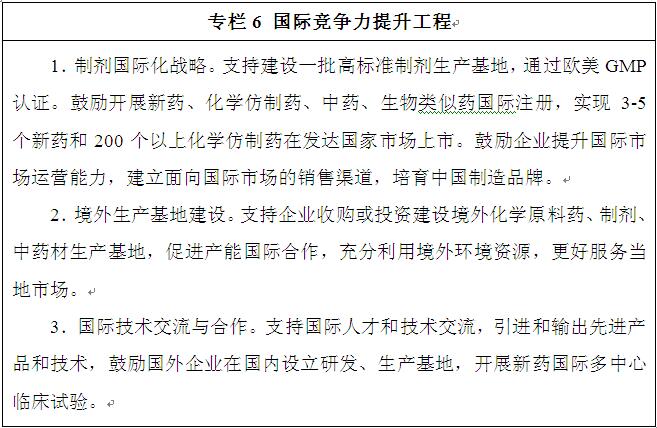 加強國際技術合作。優(yōu)化投資環(huán)境,深化與國外醫(yī)藥企業(yè)合作,推動引資、引技、引智有機結合,實現(xiàn)合作共贏。支持企業(yè)建立跨境研發(fā)合作平臺,充分利用國際資源,發(fā)掘全球創(chuàng)新成果。鼓勵開展新藥國際臨床研究,實現(xiàn)創(chuàng)新藥走向國際市場和參與國際競爭。引領中藥國際標準制定,為中藥走出去創(chuàng)造條件。